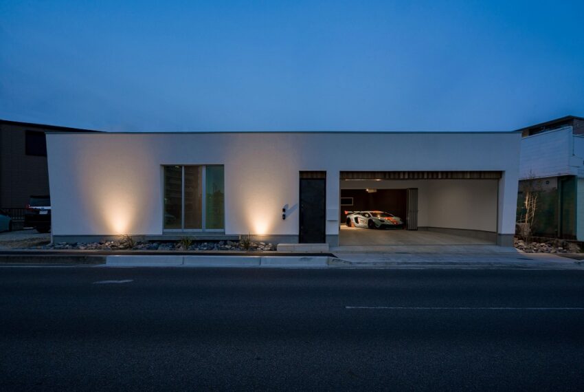 - 中庭を直線の”ロ”の字で囲んだリゾートの平屋建て。曲線の美しいランボルギーニのためのビルトインガレージ。