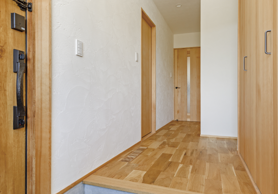 レッドシダーを使用した玄関まわり。白の壁に無垢材のの質感を活かしたこだわりのデザイン