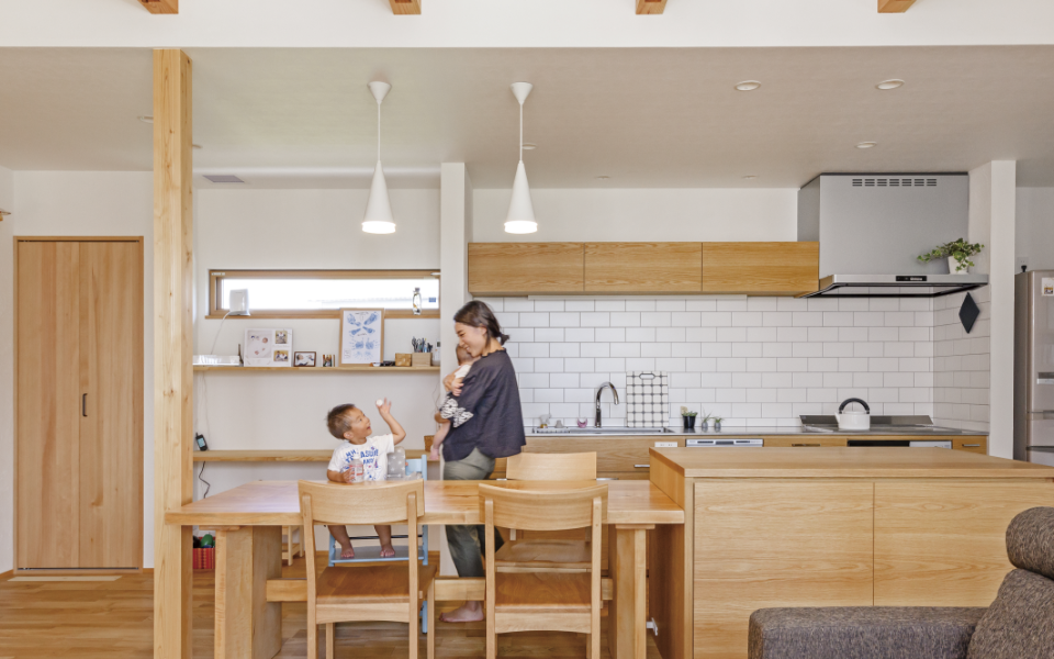無垢の床材に合わせたキッチンも、オークでオーダーメイド。「オープンスタイルにすることで、子どもに料理している様子を見せるキッチン空間になりました」