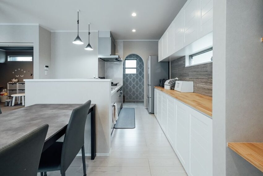 - グレイッシュな外観、潔い白い空間のスタイリッシュな家